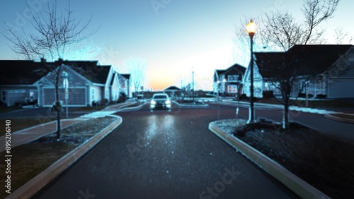 © TechAnimationStock, Fototapeta premium Futuristic autonomous car scanning for obstacles in American neighborhood. Blue sensor animation overlay.