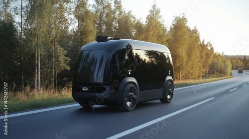 Fototapeta premium Futuristic Autonomous Delivery Vehicle on Road in Scenic Countryside