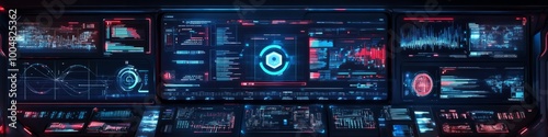 © Andrew, Obraz premium Futuristic Banner Cybersecurity Interface with Advanced Firewalls and Blockchain Technologies
