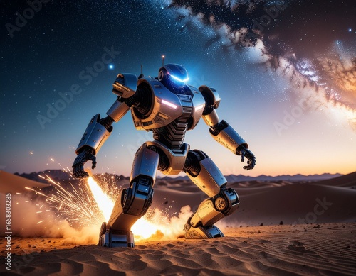 Fototapeta premium Futuristic battle mech robot in desert under starry sky with sparks