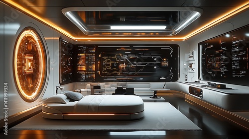 Obraz premium Futuristic Bedroom Interior Photo With Advanced Technology And Minimalist...