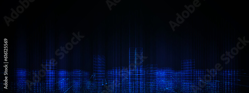 Fototapeta premium Futuristic big data city data technology modern blue background banner concept, wireframe skyline connecting link structure dark blue contrast copyspace.