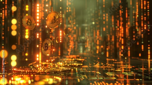© E , Naklejka premium Futuristic Bitcoin Cryptocurrency Digital Matrix with Orange Glowing Lights.