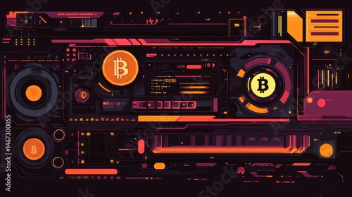 Fototapeta premium Futuristic Bitcoin mining interface with digital currency symbols and circuit...
