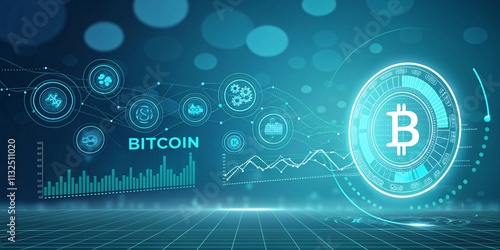 Obraz premium Futuristic bitcoin visualization, digital cryptocurrency concept, glowing blue technology background, financial chart and graph V4