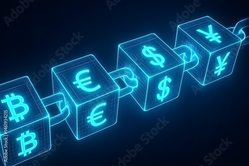 Fototapeta premium Futuristic blockchain technology with global currency symbols and cryptocurrency bitcoin representing digital financial transactions and innovation.