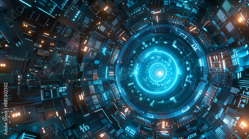 Fototapeta premium futuristic blue circular portal with glowing energy and complex digital patterns,