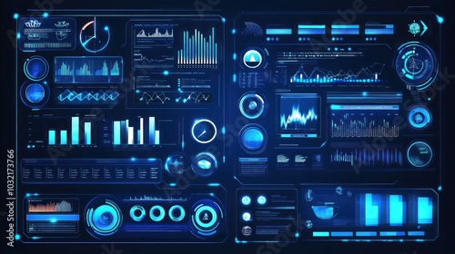 Obraz premium Futuristic blue digital interface with various graphs, charts, and data representations.