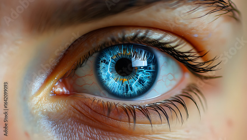 Fototapeta premium Futuristic blue eye with intricate circuitry iris pupil