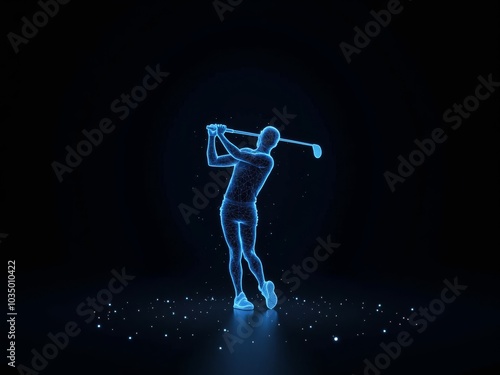 Obraz premium Futuristic blue hologram of golf player doing pose on dark background