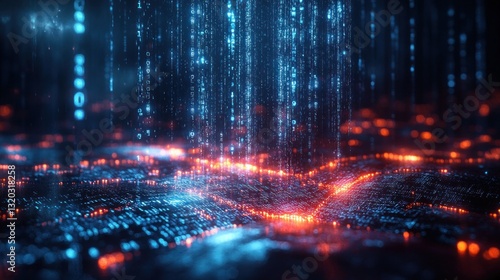 © Margarita, Fototapeta premium Futuristic Blue Matrix Background with Falling Binary Code and Digital Technology Stream Illustration