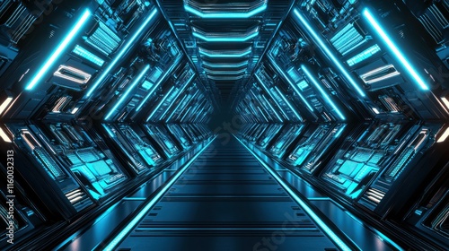 © bulegendut, Obraz premium Futuristic blue neon lit corridor.