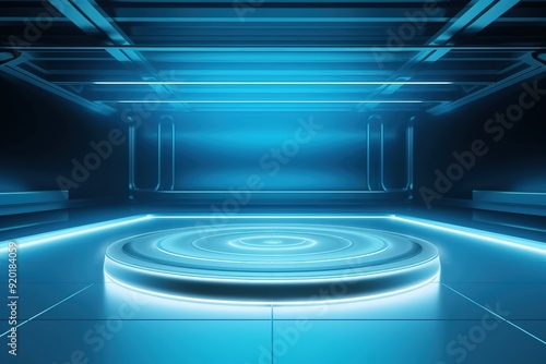 Obraz premium Futuristic blue platform with glowing neon lights.