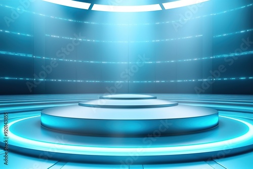 © hfwstudio, Obraz premium Futuristic blue platform with neon lights.