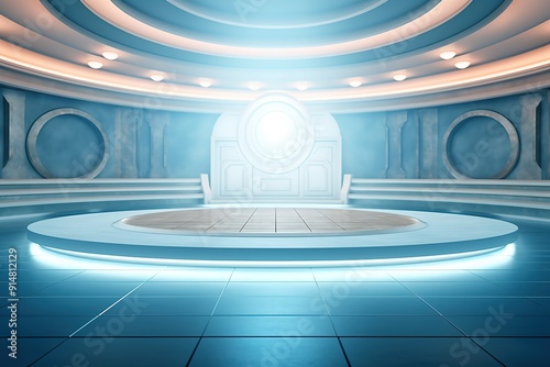 Obraz premium Futuristic blue stage with glowing lights.