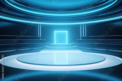 Obraz premium Futuristic blue stage with glowing platform.