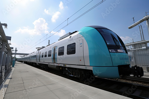 © rufous, Fototapeta premium Futuristic blue train with wind turbines and solar panels