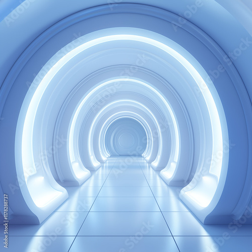 Naklejka premium Futuristic Blue Tunnel Abstract 3D Render Circular Archway Glowing Lights Modern Architecture SciFi Corridor