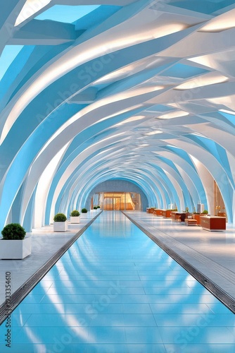 © Georgii, Fototapeta premium Futuristic blue tunnel corridor with arched arches and glowing lines leading to a modern lounge area