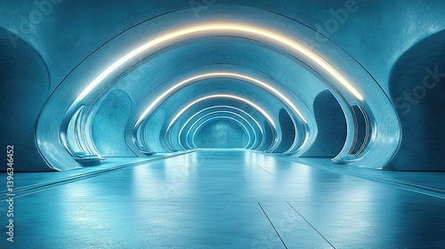 © Aris, Obraz premium Futuristic blue tunnel, glowing arches, empty space, architectural render, sci-fi design