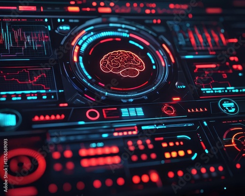 Obraz premium Futuristic braincomputer interface with digital brainwave displays,...