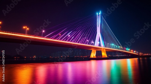 Fototapeta premium Futuristic Bridge Illuminated by Neon Lights at Night in Vibrant City Skyline
