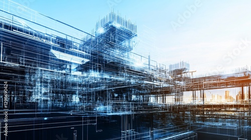 © Mustofa, Obraz premium Futuristic Building Construction Digital Rendering with Blue Wireframe