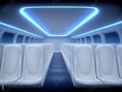 Fototapeta premium Futuristic cabin of a passenger aircraft showcasing sleek white seats illuminated by ambient blue lighting creating a modern travel experience that redefines aviation aesthetics