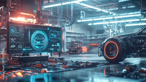 Fototapeta premium Futuristic Car Diagnostic in a High-Tech Garage
