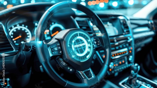 © lililia, Fototapeta premium Futuristic car interior features digital dashboard with speedometer, map, and other vehicle info screens. Digital steering wheel is sleek and modern