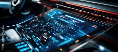 Fototapeta premium Futuristic car interior with a large central display showing various data and...