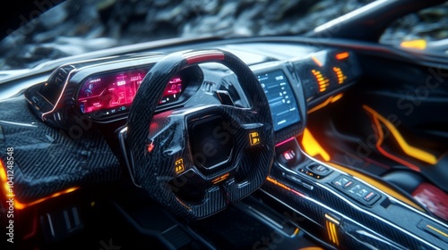 © Andre Jovi, Obraz premium Futuristic Car Interior with Carbon Fiber and Neon Lights