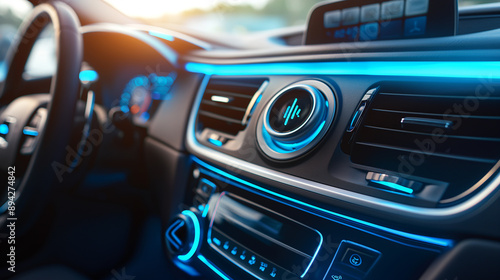 Naklejka premium Futuristic car interior with illuminated dashboard and steering wheel.
