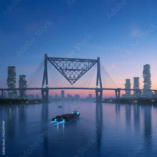 © putra, Naklejka premium Futuristic Cargo Ship Navigating Under Sleek CableStayed Bridge.