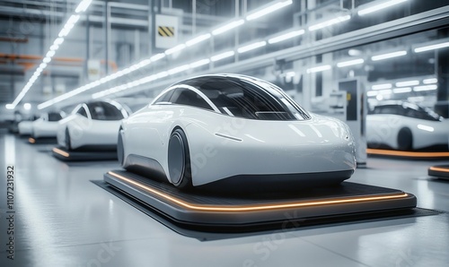 Fototapeta premium Futuristic cars in a high-tech manufacturing facility.