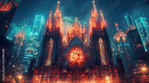 Fototapeta premium futuristic cathedral illuminated by neon lights, surrounded by skyscrapers