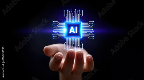 © Oatkhaphon, Fototapeta premium Futuristic chip glowing as artificial intelligence brain in hand, symbolizing advanced technology and innovation