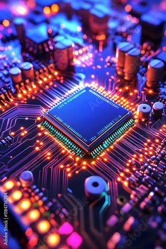 © ruangrit19, Obraz premium Futuristic Chip on Glowing Neon Motherboard Surrounded by Circuit Wires