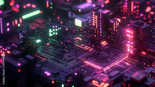 © isend, Fototapeta premium Futuristic Circuit Board Cityscape Neon Lights Glow
