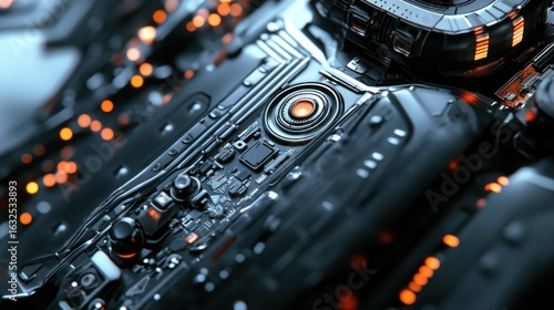 Fototapeta premium Futuristic circuit board close-up with glowing components; technological...