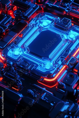 © Tackey, Fototapeta premium Futuristic Circuit Board Design Featuring Blue and Red Neon Lighting, Abstract Technology Background with Glowing Elements and Intricate Structures