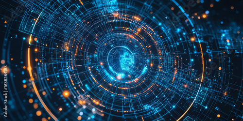 Fototapeta premium Futuristic circuit board design with glowing circular lines and interconnected nodes, tech background