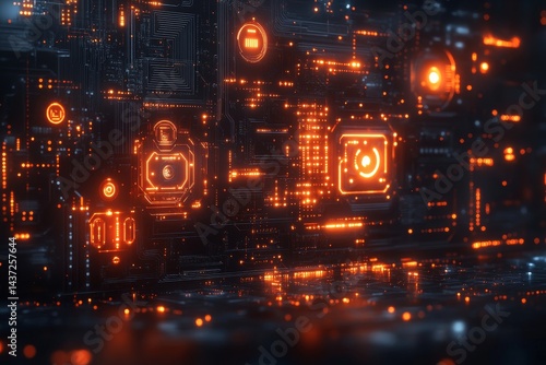 © sennauli, Obraz premium Futuristic Circuit Board Glowing, Data Processing