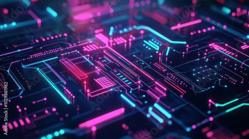 Obraz premium Futuristic circuit board, glowing neon patterns, abstract digital grid, dark...