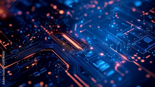Obraz premium Futuristic circuit board, glowing pathways, data flow, digital technology,...