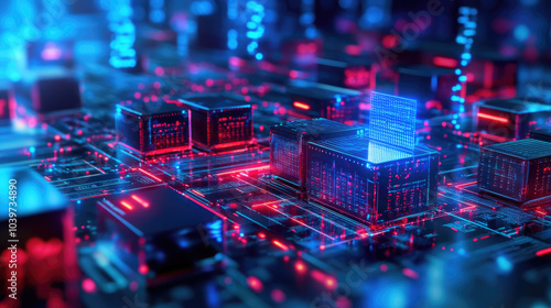Obraz premium Futuristic circuit board landscape, intricate electronic components glowing in vibrant blue and red light, representing advanced technology and digital innovation.