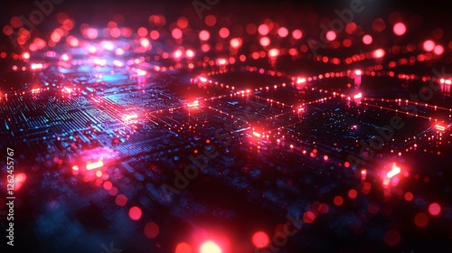 © Suparerk, Fototapeta premium Futuristic Circuit Board, Red & Blue Neon Lights