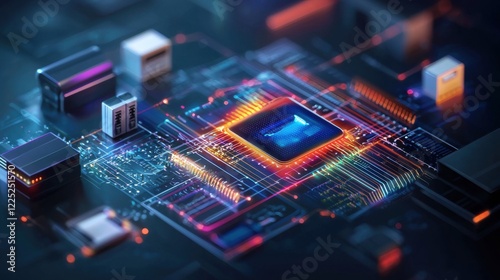Obraz premium Futuristic Circuit Board with Illuminated Microchips and Digital Patterns