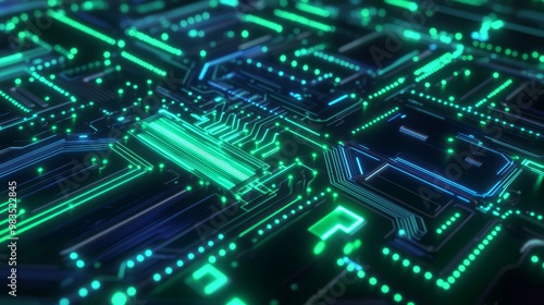 © Damerfie, Obraz premium Futuristic Circuit Board with Neon Lights and Technology Elements