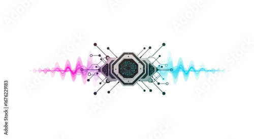 Obraz premium Futuristic circuitry design with vibrant wave patterns in a hexagonal shape